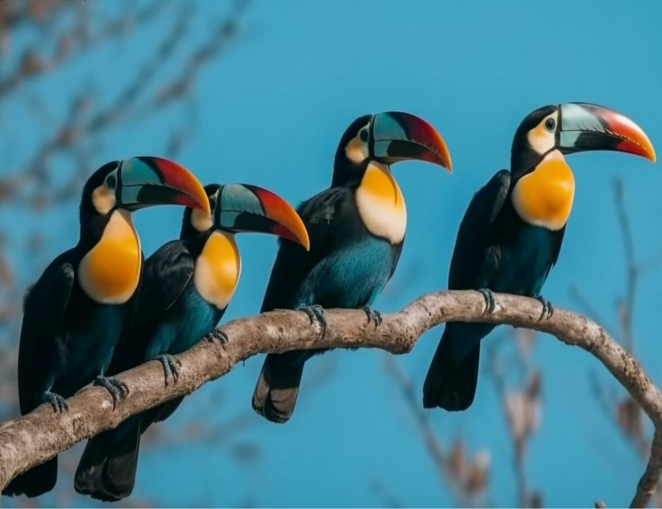 Toucans have long, colourful beaks that are lighter than they appear, made of a substance called keratin.